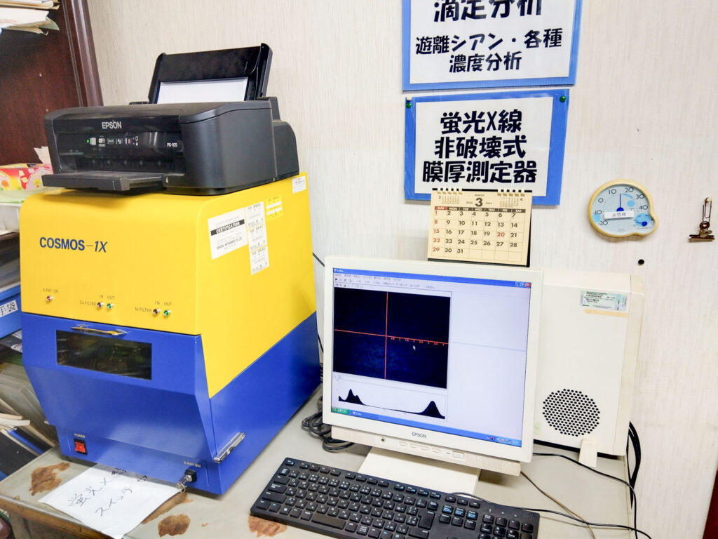 蛍光X線膜厚測定器にてめっき皮膜の厚さ測定を行います。素材やめっき皮膜の成分解析も可能です。